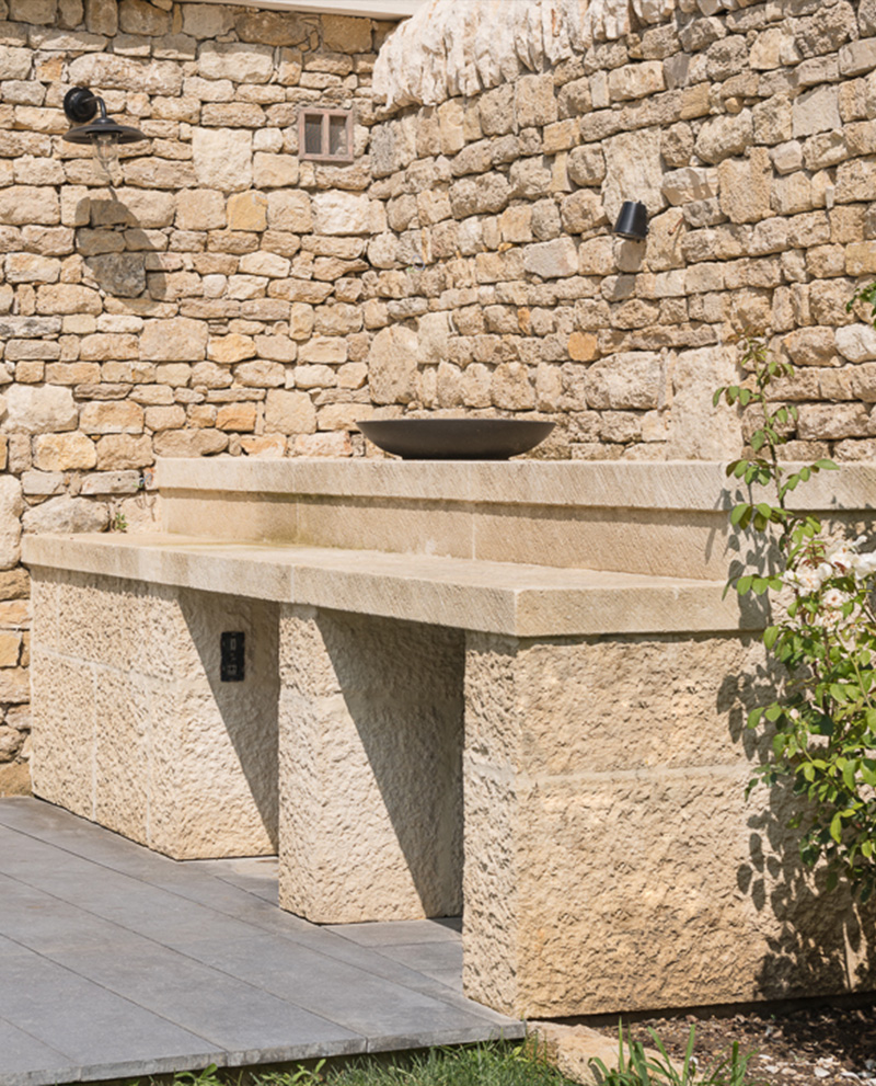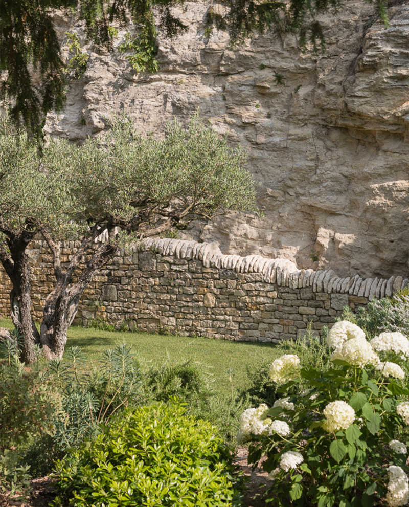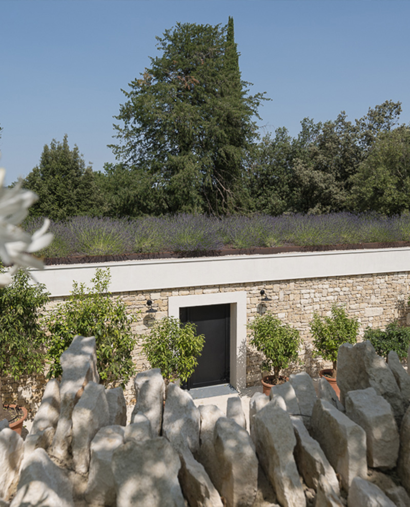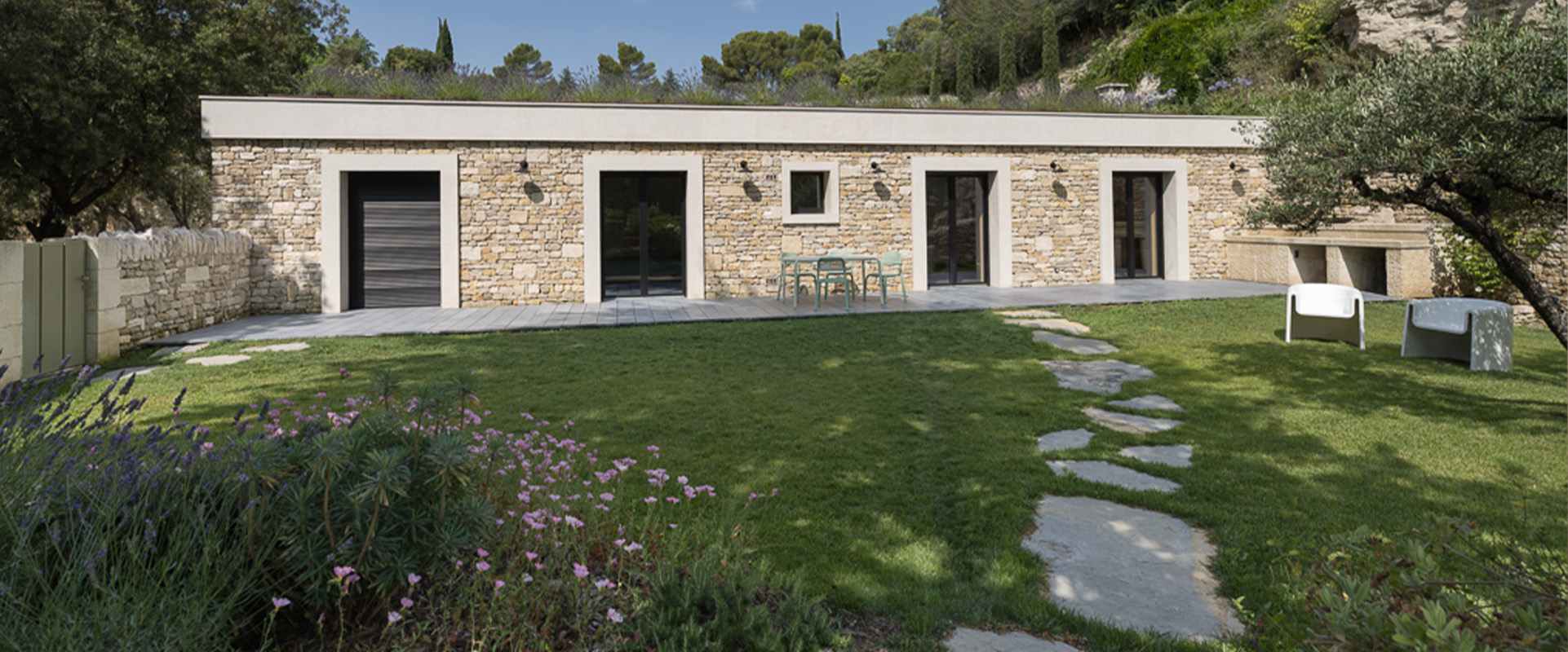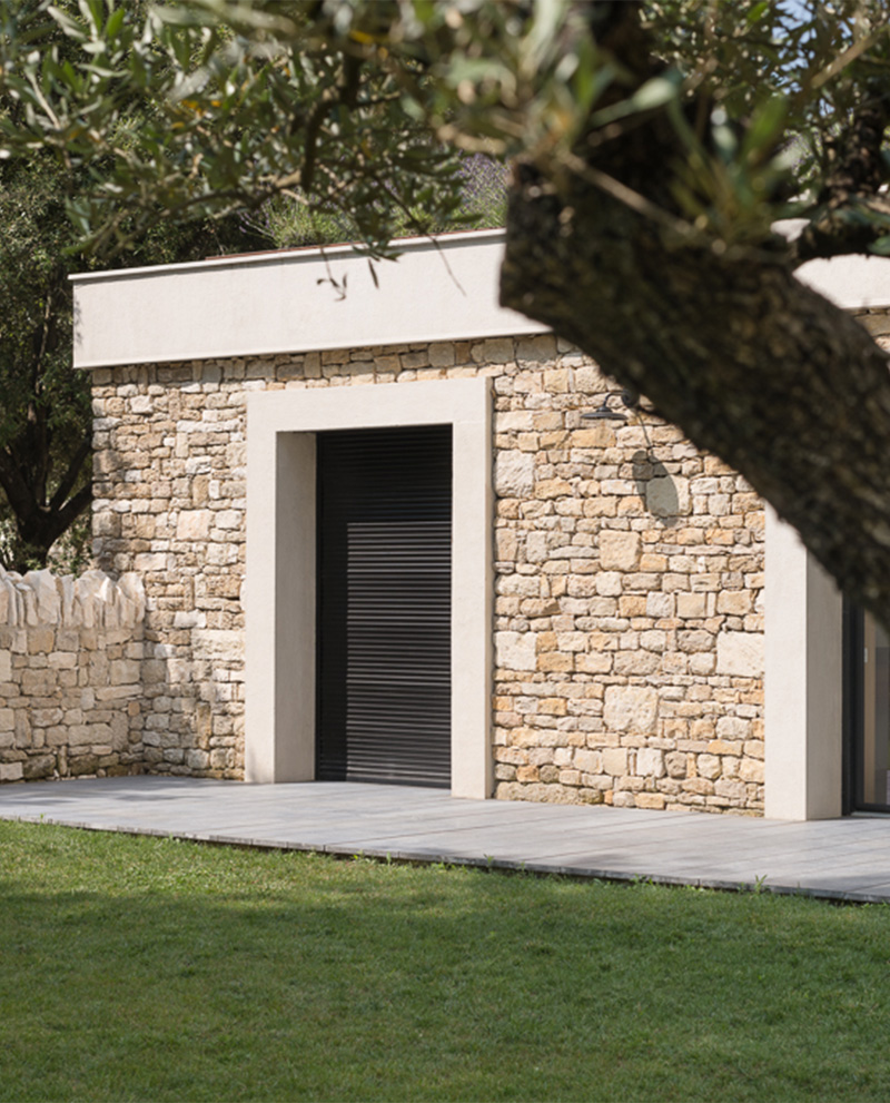 Les façades sont rythmées par des doublages en pierre, et les acrotères reçoivent une finition façon pierre bouchardée, évoquant le savoir-faire local. Les murs de clôture en pierres bâties à sec sont surmontés de lauzes posées verticalement, comme autrefois, pour empêcher les bêtes de troupeau de franchir les enclos.